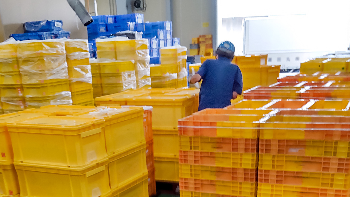 洗浄済の通箱をパレットに積み上げるまでの作業を行っています。