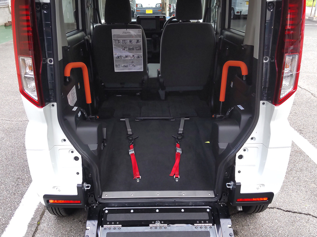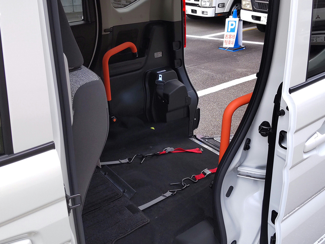扱いやすいスロープ式ですので、車イスの乗り降りもスムーズ。車イスの固定も簡単、安全に行なえます。